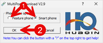 - Upon launching the tool, select “Feature phone” or “Smart phone” depending on your MediaTek device and click “OK”.