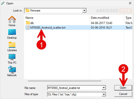 - Click on “Select File” under the Scatter file option and then “locate” the Scatter File inside the Firmware Folder.