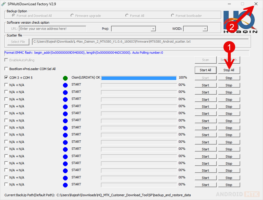 - Click on the “Stop All” button, close the HQ MTK Customer Download Tool, and disconnect your MediaTek device from the computer.
