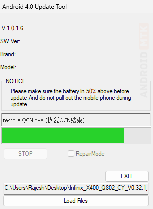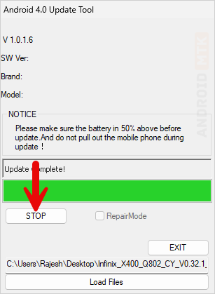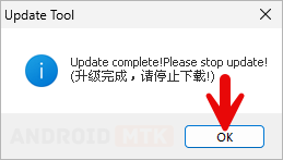 - Once the flashing process is completed, a Popup Dialog Box will appear on the Screen saying “Update Complete! Please Stop Update!”. Click on the “OK” button.