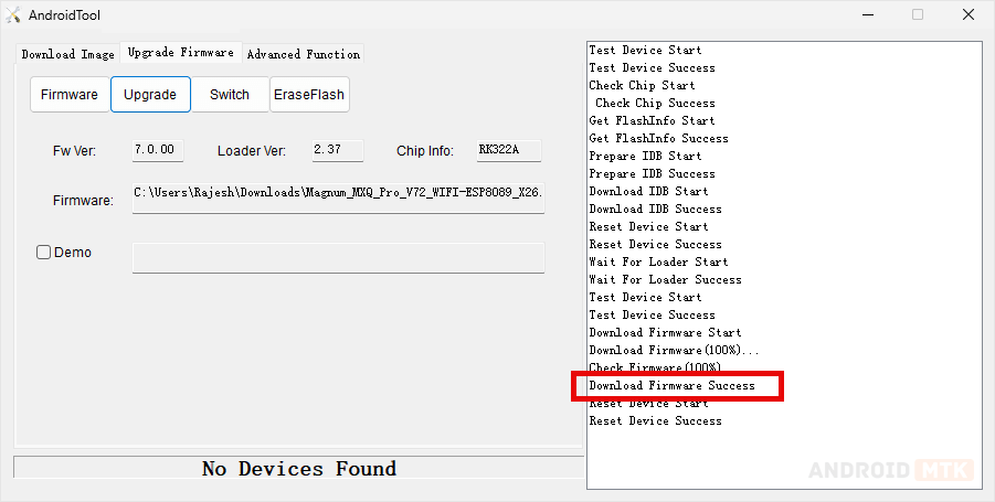 14. After the flashing process is finished, you will see a message that says “Download Firmware Success”.